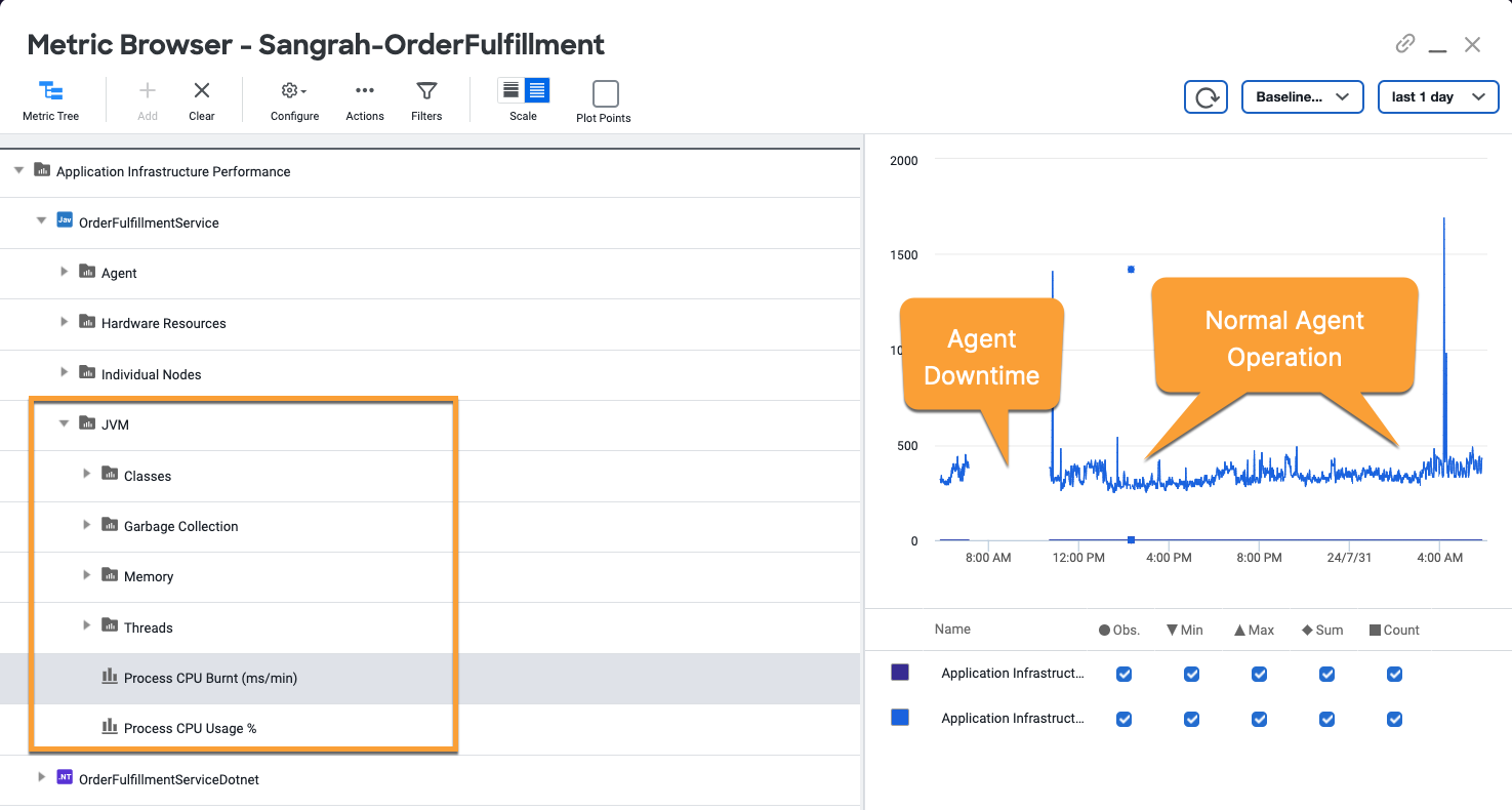 - The agent records JVM resource consumption data during the downtime. You can see this data in the Controller UI.