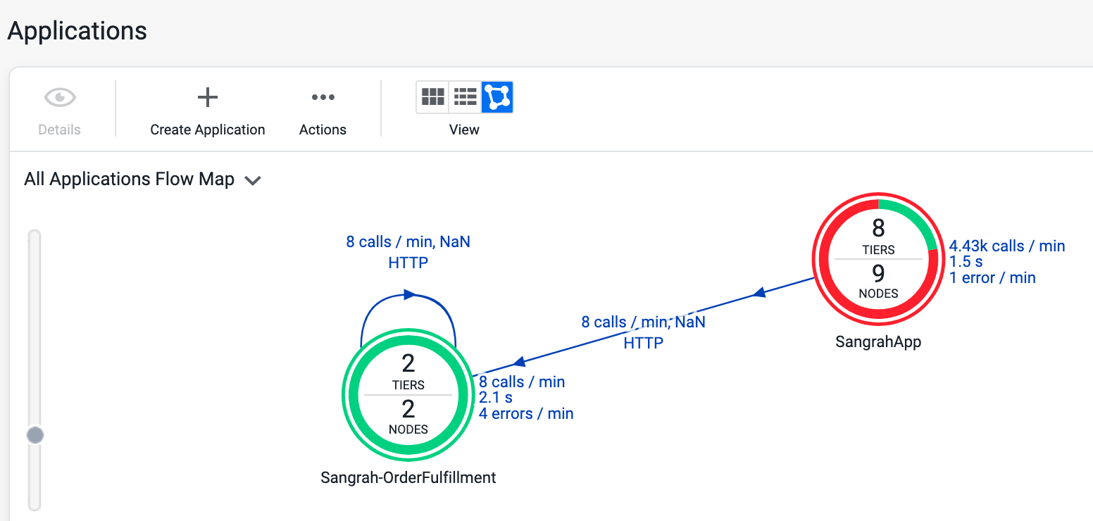 The Applications tab in the Controller UI provides several views of the business applications in your account: a card view, list view, and flow view. To access the cross application flow map, click the flow view link in the tab.