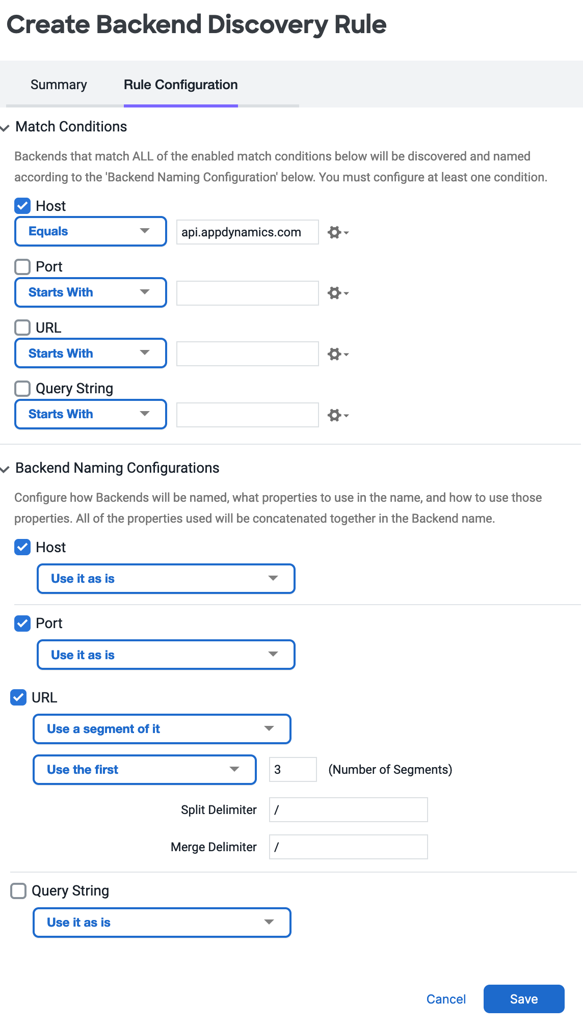 By default, Splunk AppDynamics uses the host name and port number to detect and name HTTP backends. This may be suitable in many cases, however, when your microservices, containers or serverlets are managed by an API gateway or portal, backend services communicating with a client or with each other cannot be correctly mapped to the proper tiers unless you edit automatic discovery to use a portion of the query string or use HTTP custom discovery rules to uniquely name them. Splunk AppDynamics recommends you create a custom HTTP backend discovery rule in this case.