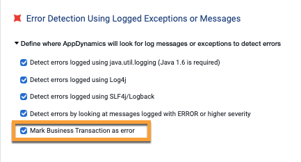 If you do not want any logged errors to cause transactions to be reported as errors, clear the "Mark Business Transaction as error" checkbox. If you do not want to capture logged messages at all, clear the "Detect Errors" checkbox.